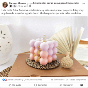 El curso es hermoso y las clases son muy claras. La plataforma me funcionó perfecto y aprendí a hacer mis velas rápidamente porque la profesora explica con muchísima paciencia. Gracias a Dios ya tengo mis primeros pedidos y poco a poco mi emprendimiento va creciendo. Sin duda, este curso está hecho con mucho amor.